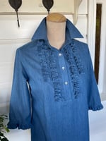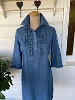 Pure cotton mid blue chambray tab front tunic dress with 4 frills on front and a 3/4 length sleeve with a frill.