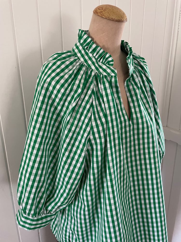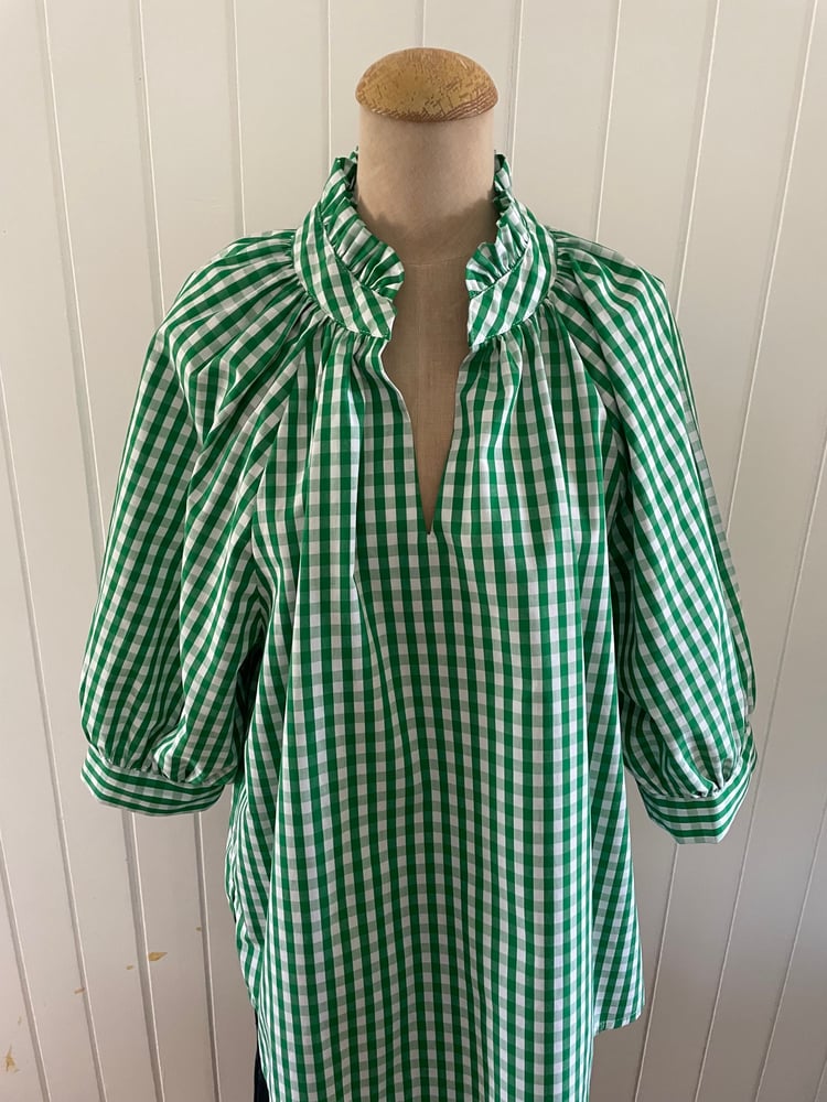 Gorgeous pure cotton check top with a 3/4 length raglan sleeve with cuff and a frill collar. This oversize top comes in 2 'Free' sizes XS-M fits up to a size 16 comfortably and L-3XL fits up to a size 26 comfortably.
