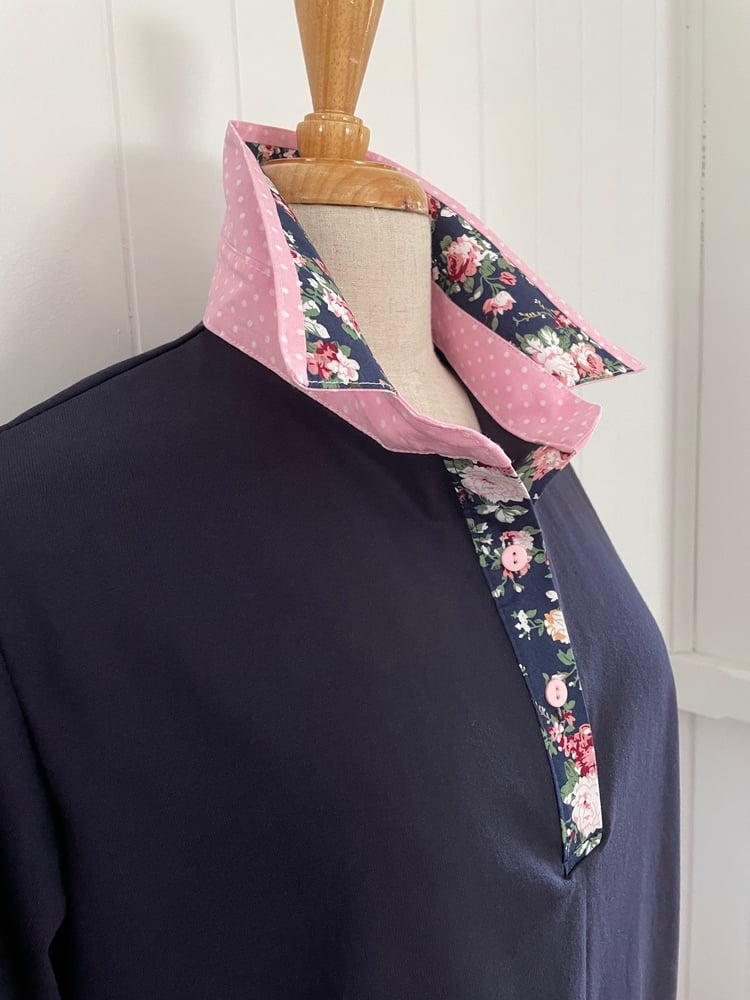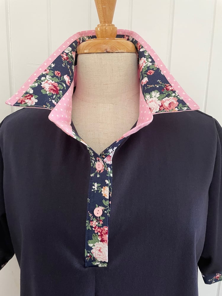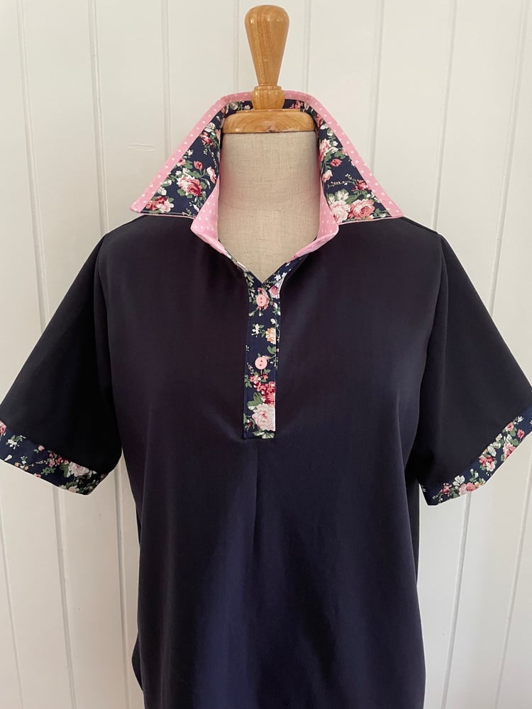 Cotton rich polyester blend navy polo top with a navy and pink floral contrast. This is a relaxed fit.