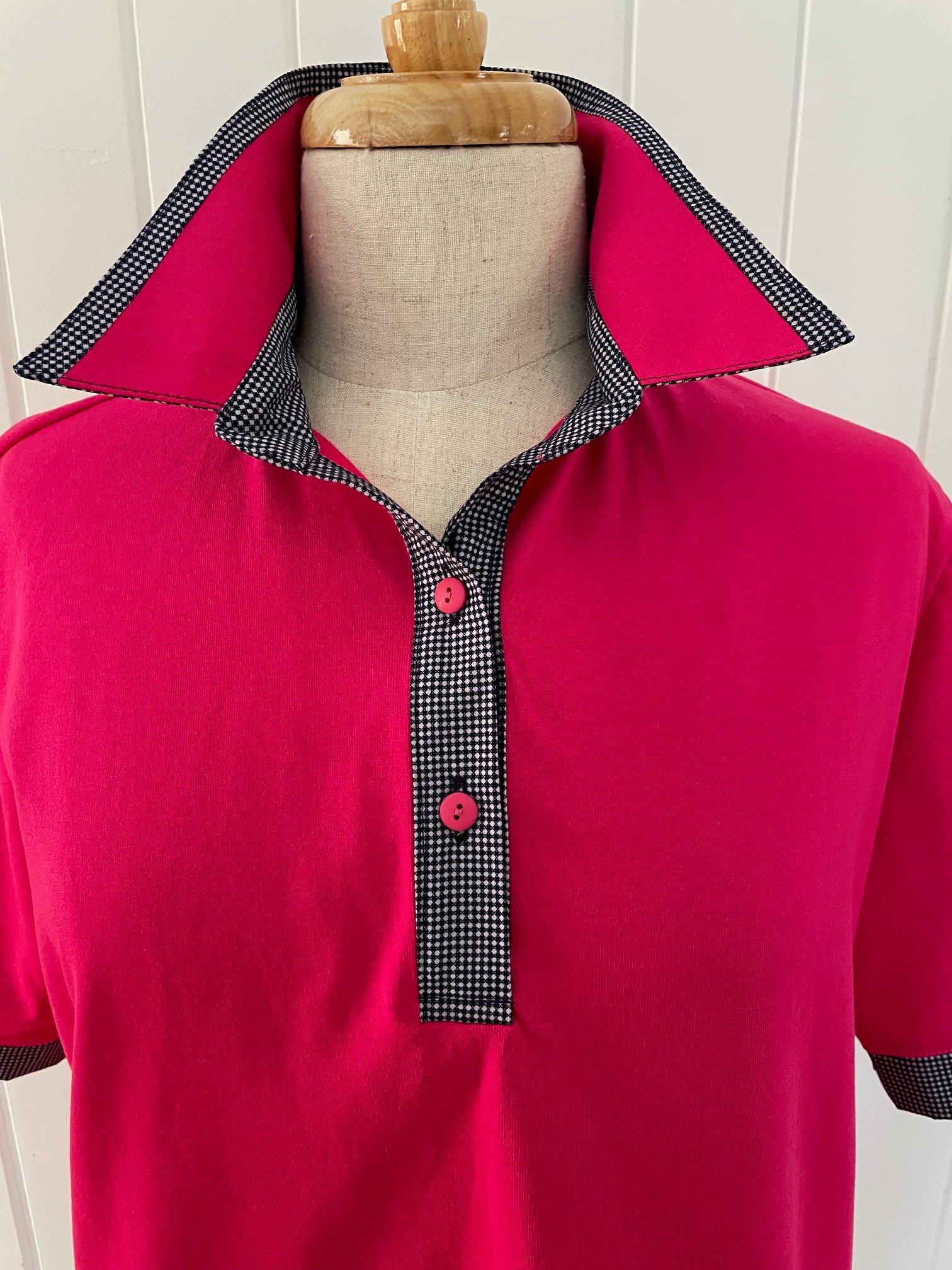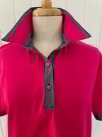 Cotton rich polyester blend hot pink polo top with navy check trims. This is a relaxed fit.