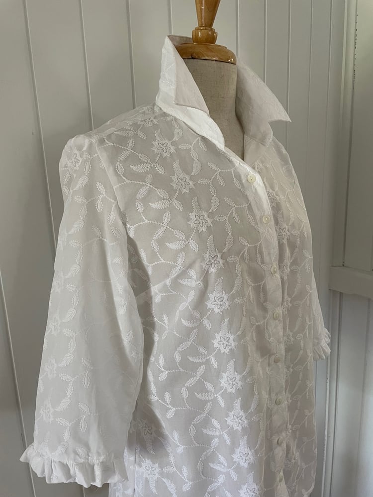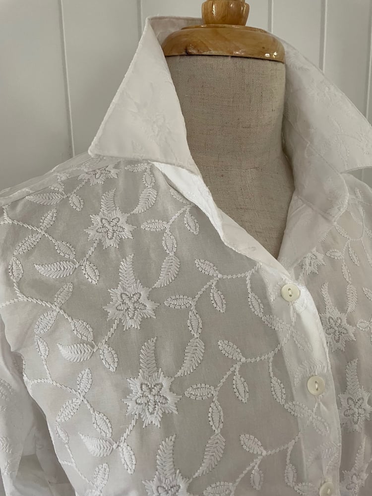 Pure Cotton beautifully embroidered shirt shown here in the classis style with 3/4 sleeves with frill. Also available to order in your preferred fitting style, Classic, semi fitted, fitted or relaxed with your choice of sleeve length - Short , 3/4 or long.