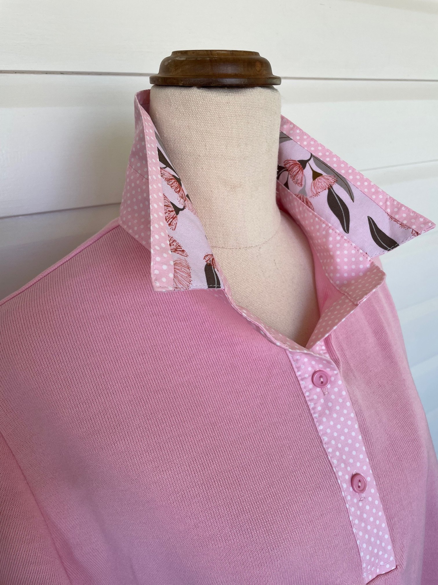 Cotton rich polyester blend soft pink polo top with gumnuts floral trim. All polo tops are in the relaxed fitting style.