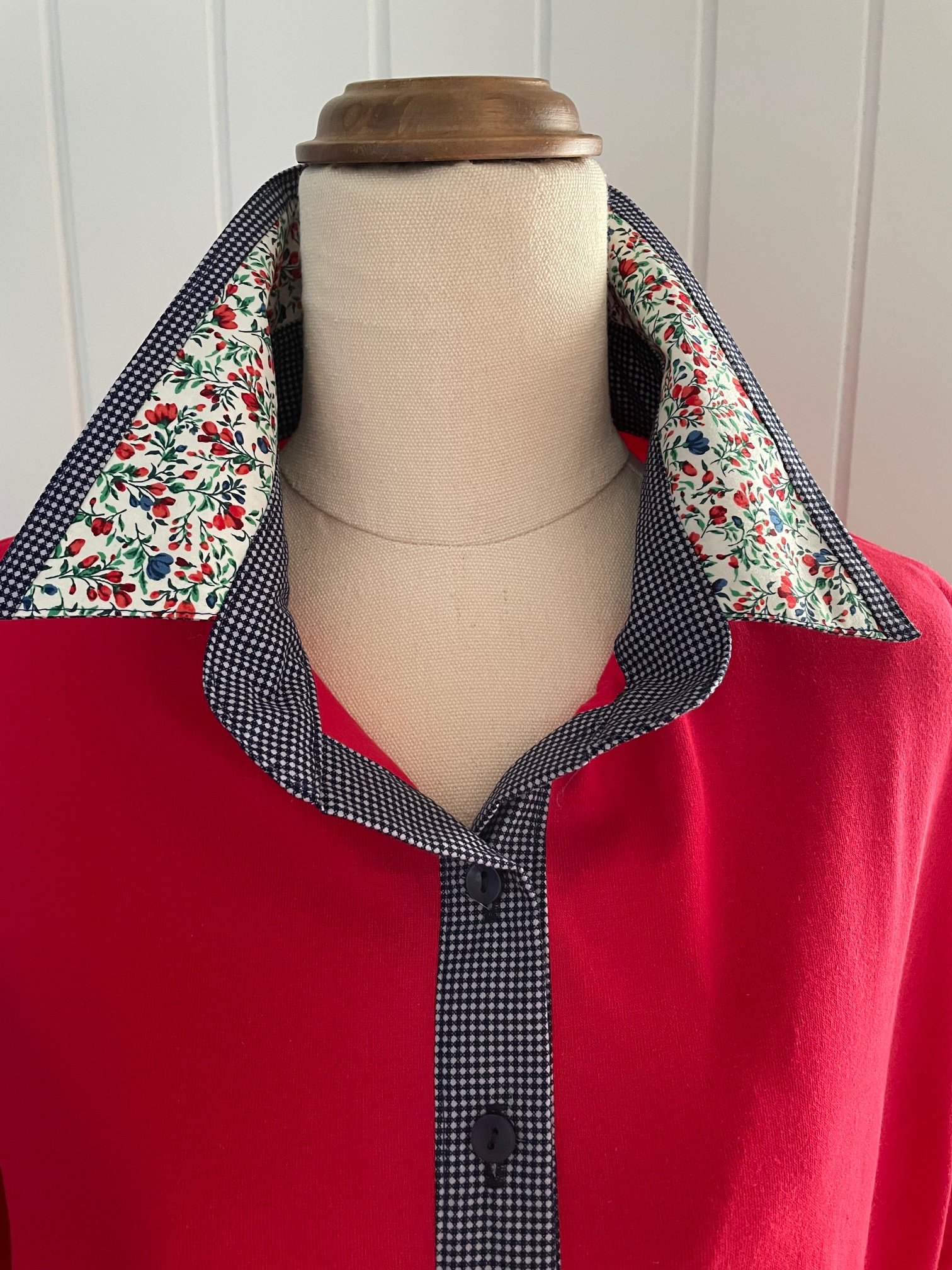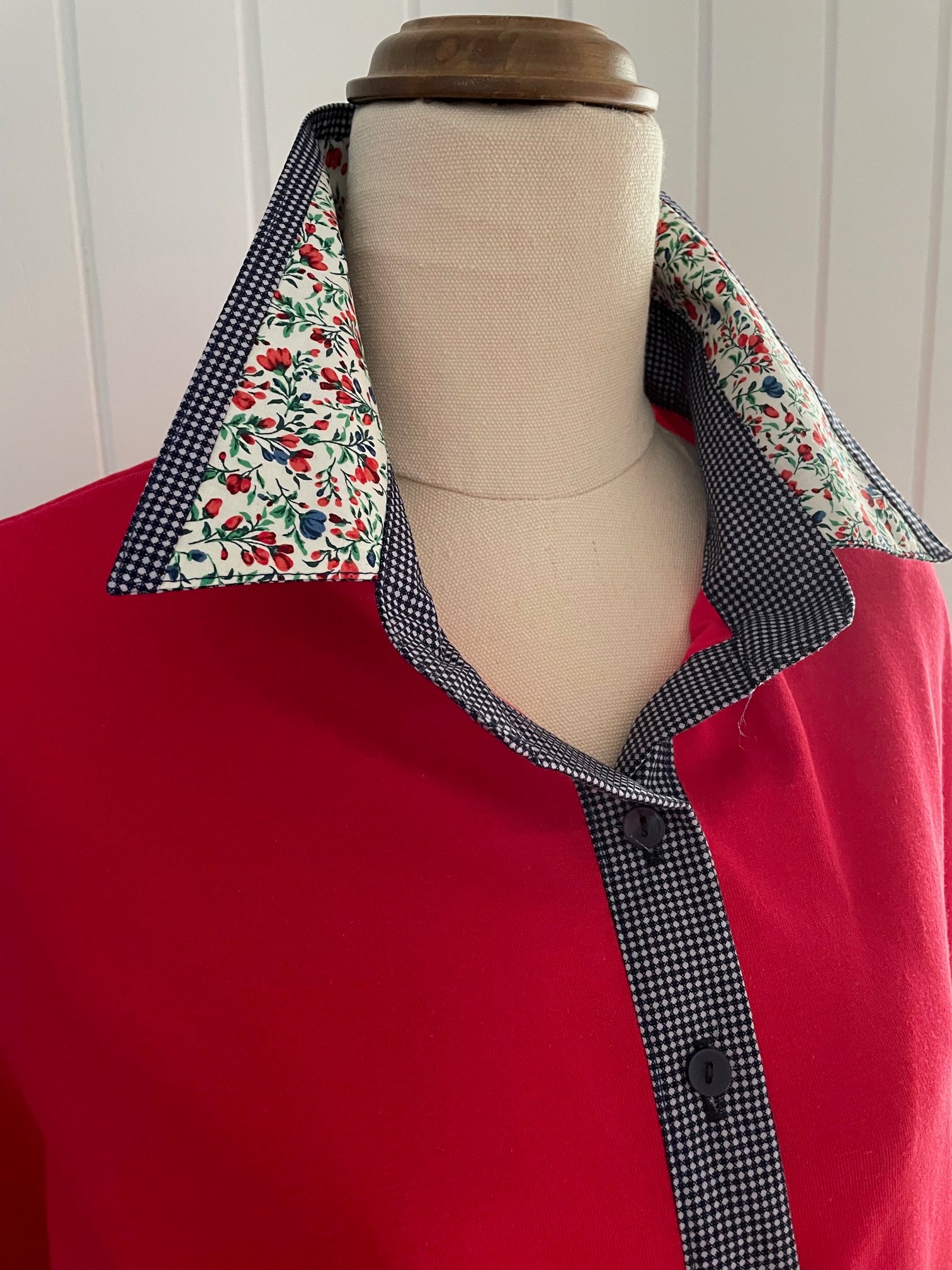 Pure cotton red polo with delicate floral trims. This is a relaxed fit