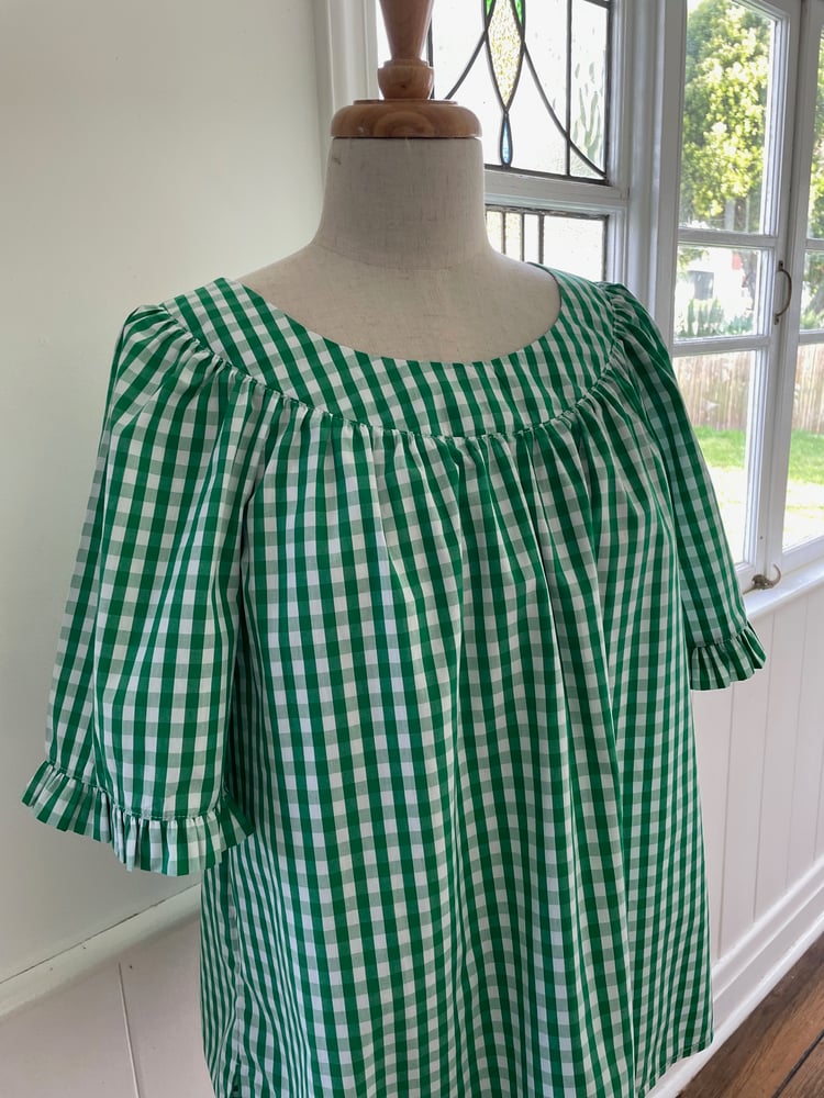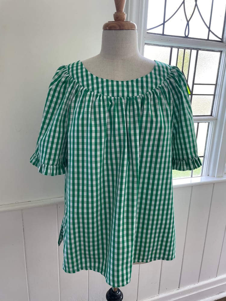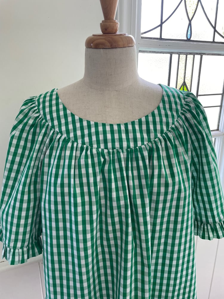Pure cotton green and white check smock top, shown here in short sleeves with frills but also available to order in a 3/4 length sleeve with cuff.
