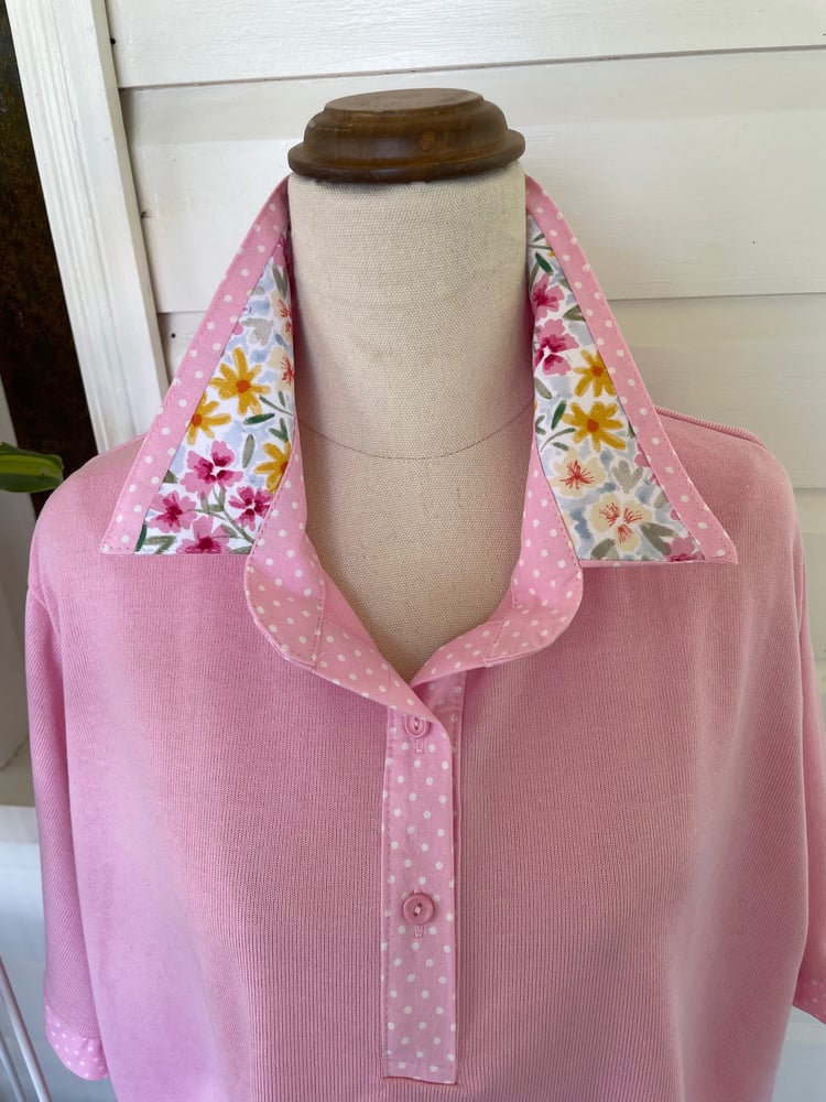 Cotton rich polyester blend soft pink polo top with floral trim. All polo tops are in the relaxed fitting styles.
