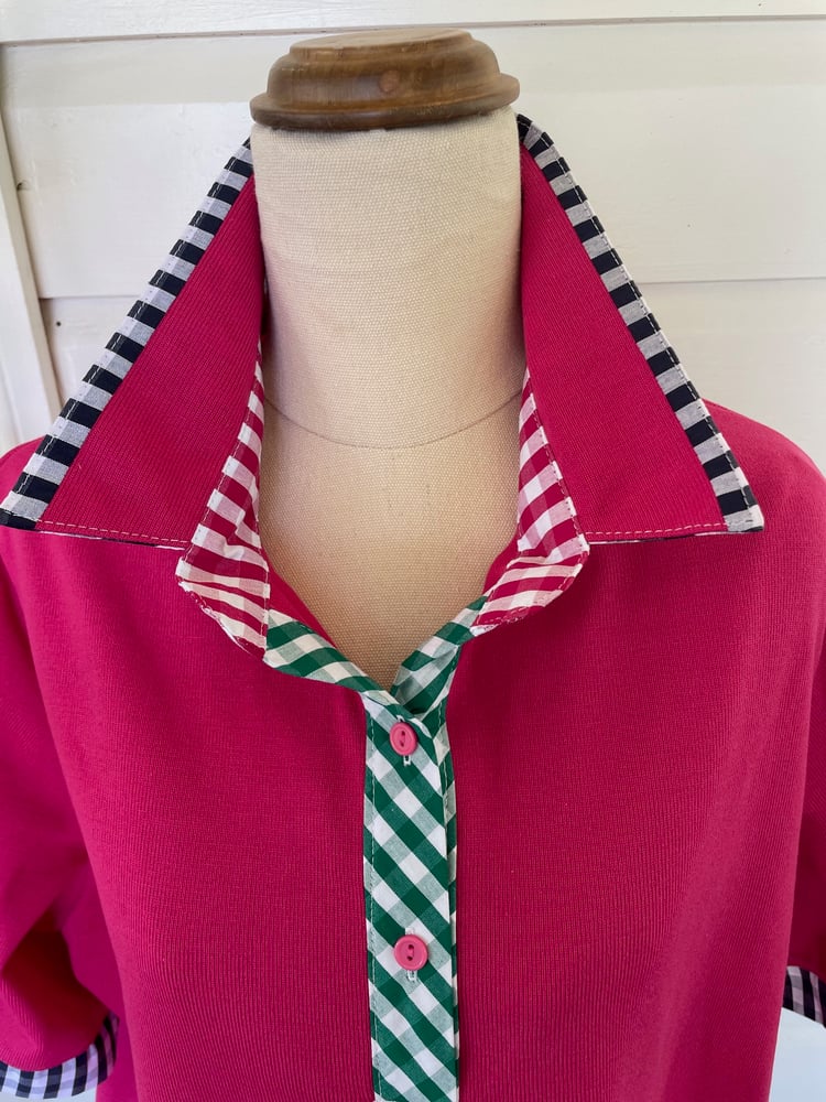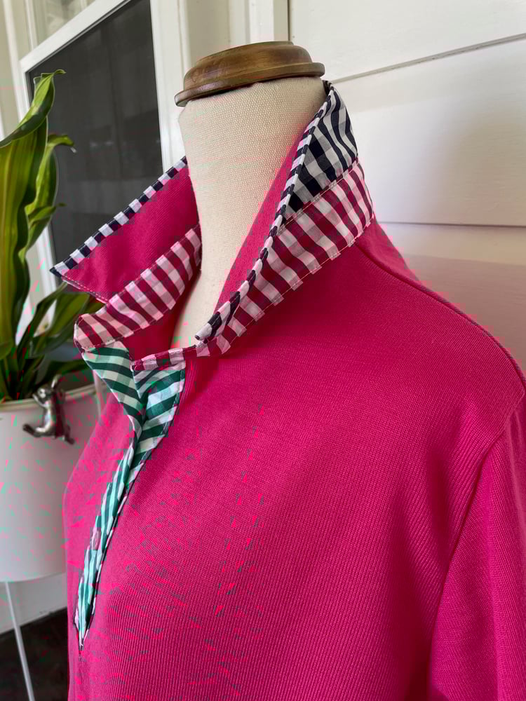 Cotton rich polyester blend hot pink polo top with gingham trims. All polo tops are a relaxed fitting style.