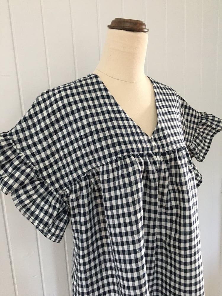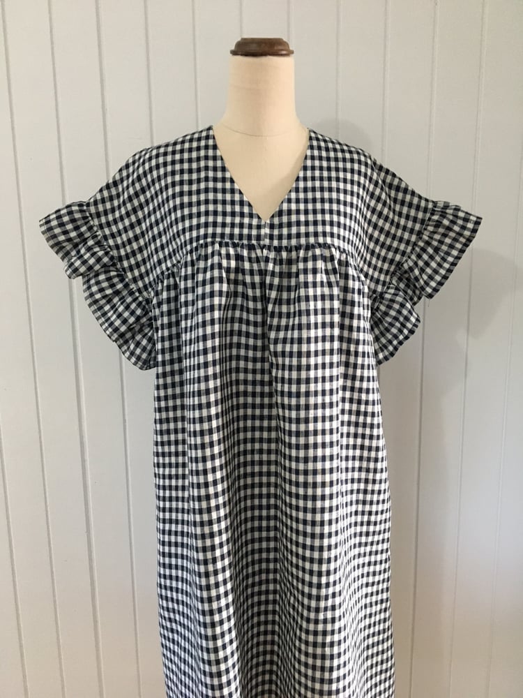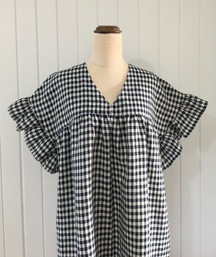Pure linen flowing dress in classic navy check with frill details on sleeves and side pockets. This is a very loose fitting dress and is just so comfortable to wear. Please order in a size smaller then you would normally wear as it is oversized.
