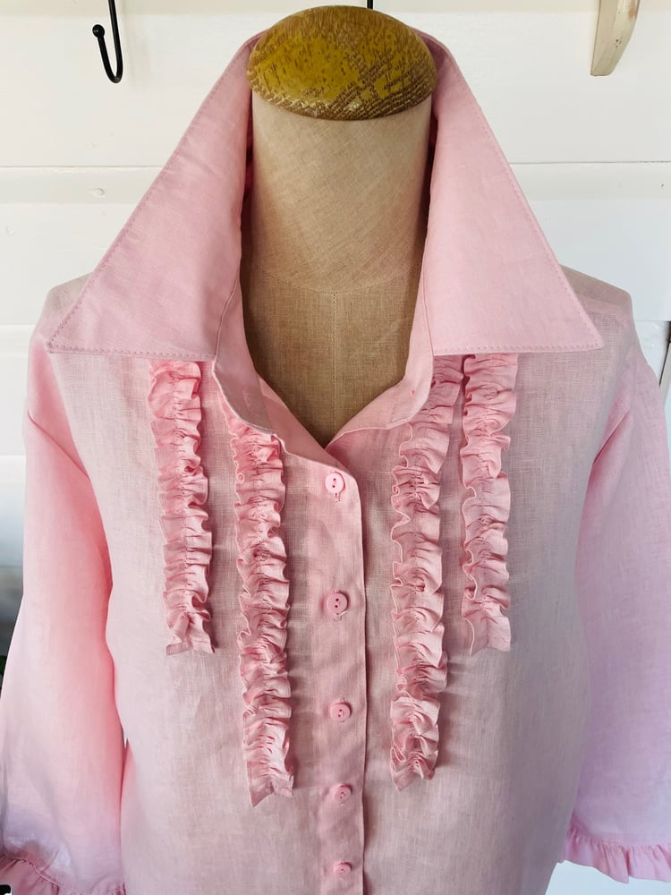 Pure linen soft pink shirt with 4 frills on front. Shown here in the Classic fitting style - also available to order in the Relaxed, Semi Fitted or Fitted Style with your choice of sleeve length - long, 3/4 or short.