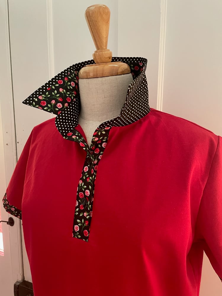 Cotton rich polyester blend polo top with roses and black sport trims. This is a relaxed fit.