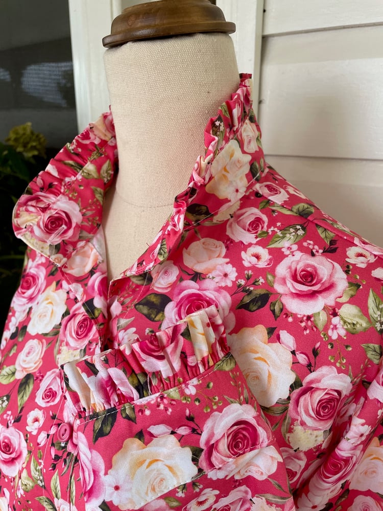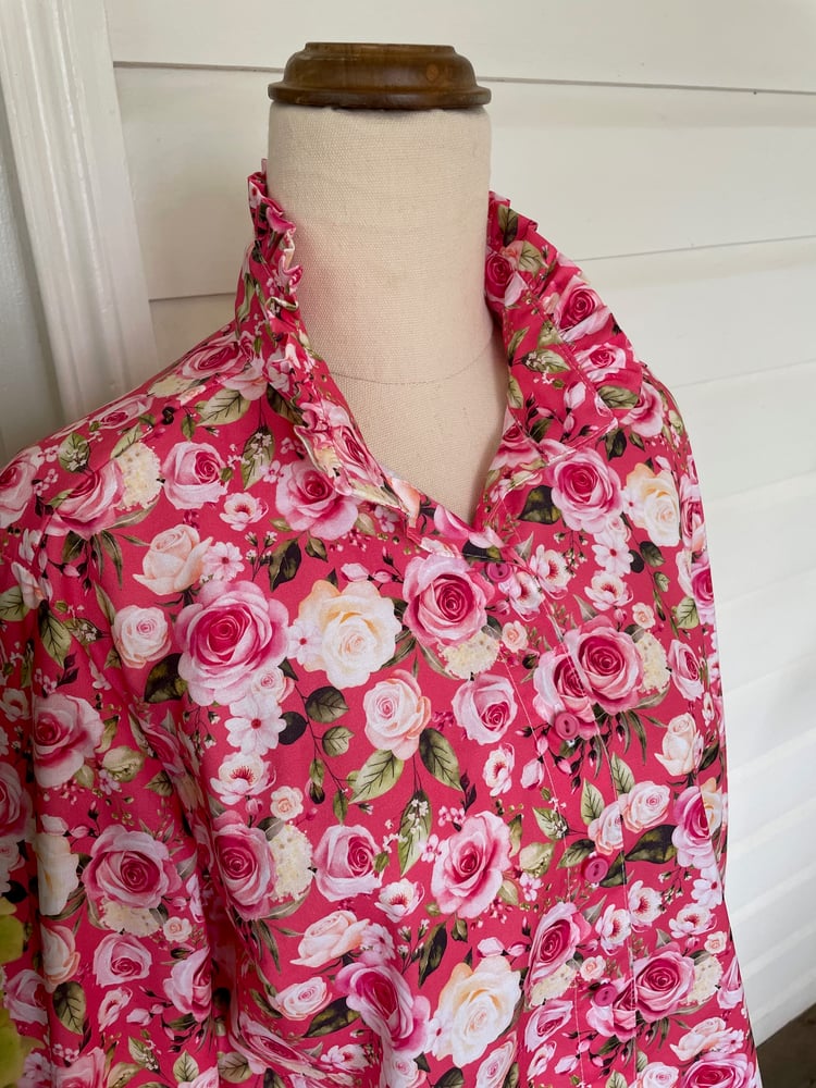 Pure cotton stunning floral shirt with frill collar and frill on the cuffs. Shown here in the Classic fit - also available to order in the Relaxed, Semi Fitted and Fitted style with your choice of sleeve length - short, 3/4 or long.