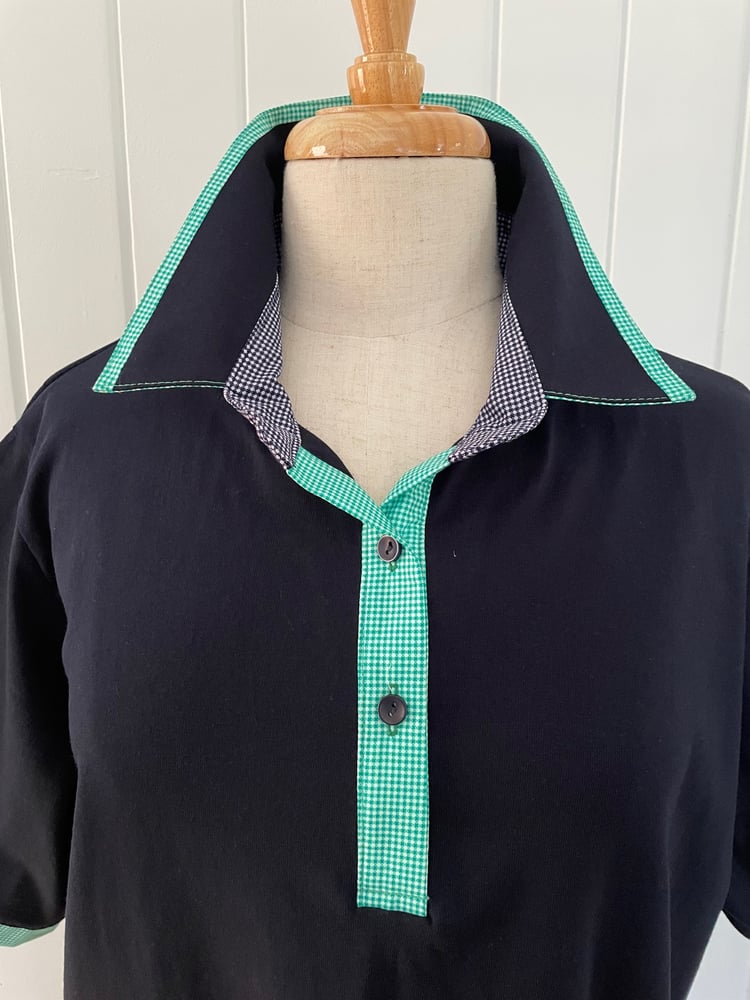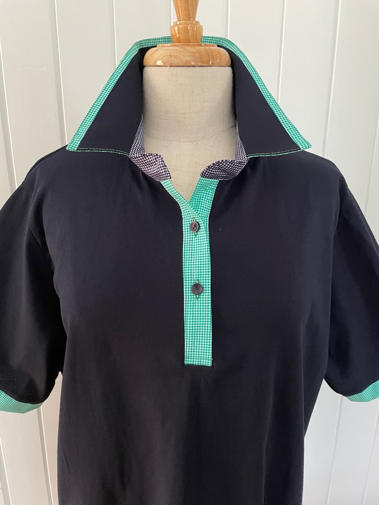 Cotton rich polyester blend navy polo top with green and navy check trims. This is a relaxed fit.