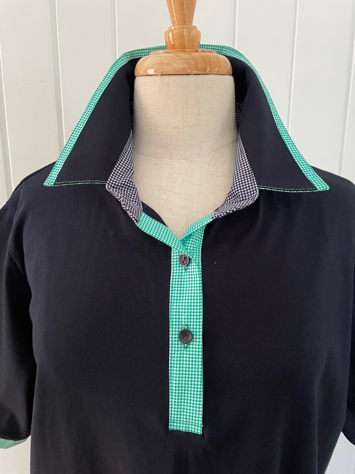 Pure cotton navy polo top with green and navy check trims. This is a relaxed fit.
