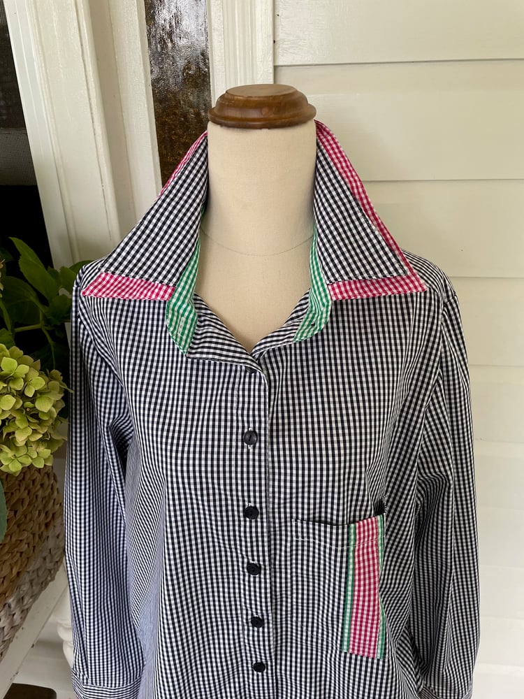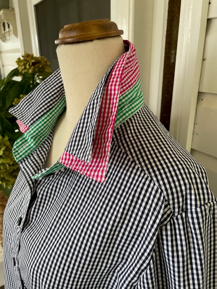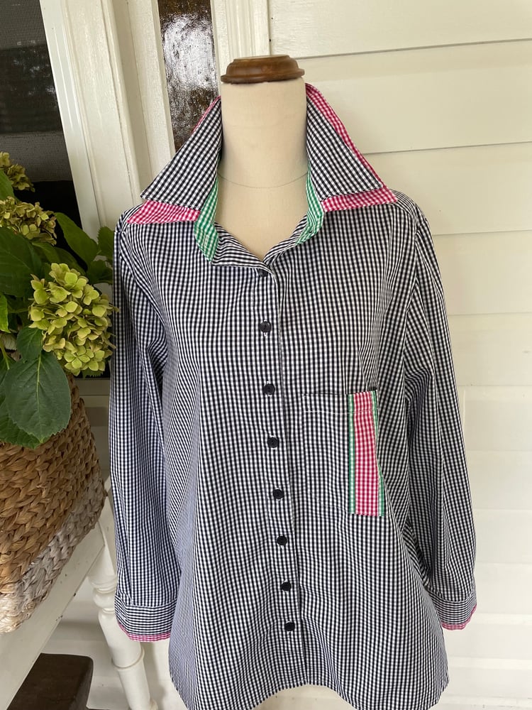 Pure cotton navy check shirt with hot pink and emerald green check trims. Shown here in the relaxed fit. Also available to order in the Classic fit with your choice of sleeve length - short, 3/4 or long.