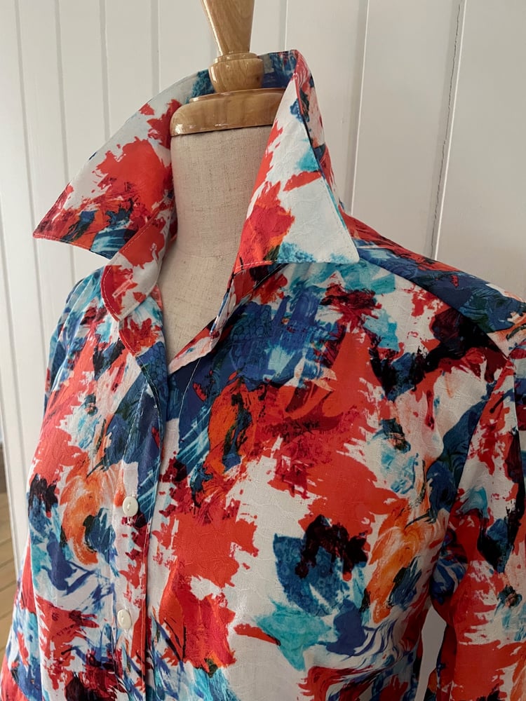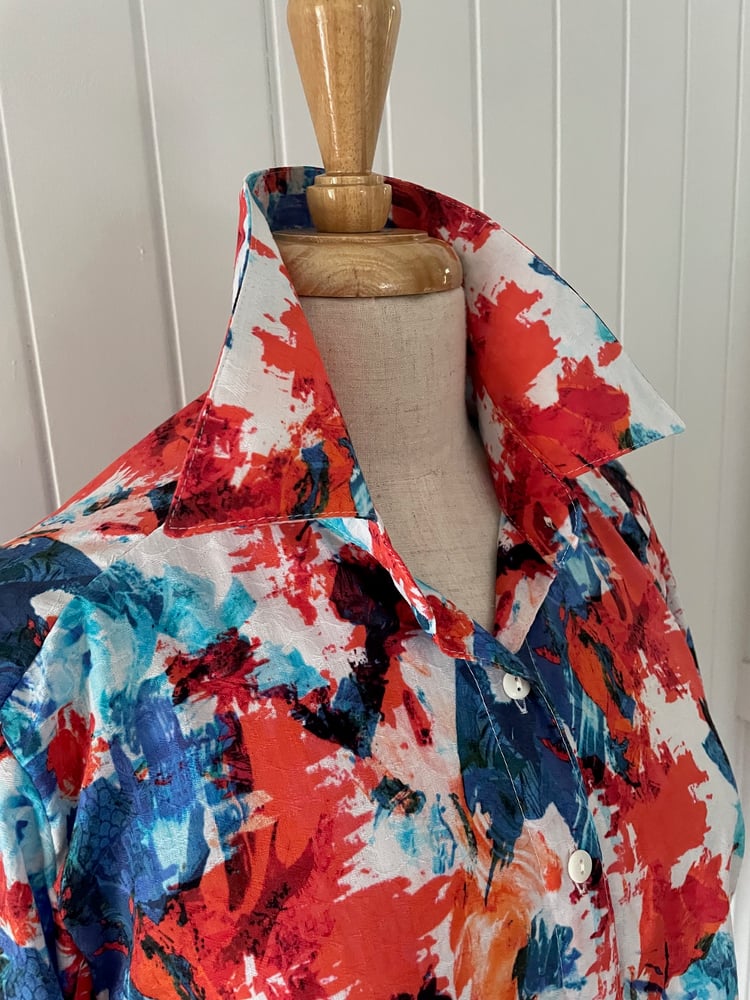 Pure cotton textured shirt with red and blue abstract print. Shown here in the semi fitted style. Also available to order in the Classic, semi fitted, fitted or relaxed fitting styles.